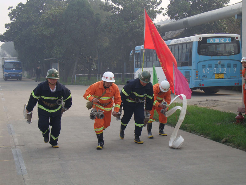 參加演練活動的有各部門、分廠及公司外協(xié)施工單位等200余人。演練前,公司消防員組織演練人員參觀“11.9”消防安全宣傳板報(bào),向他們講解滅火器的使用方法和適用范圍、防化服的穿著和空氣呼吸器的使用方法及火災(zāi)發(fā)生后如何逃生等。接著,公司消防隊(duì)員演示了明火撲救、兩盤水帶的連接和出水以及五盤水帶連接和出水。最后,各部門、分廠及施工單位進(jìn)行了明火撲救,應(yīng)急逃生等演練。