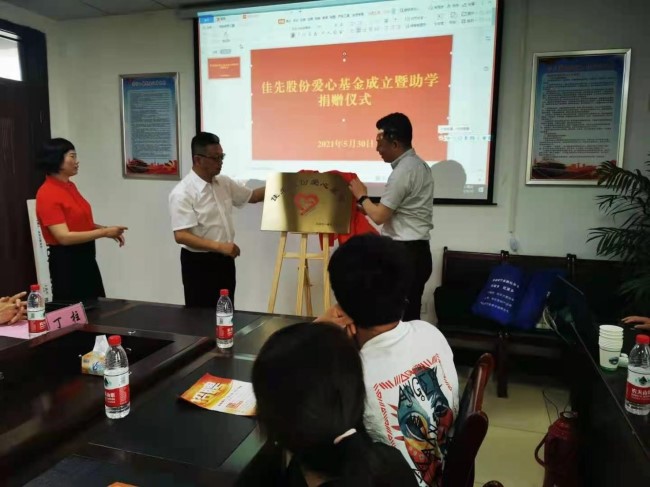 儀式現(xiàn)場,佳先股份副總經(jīng)理、工會主席丁柱介紹了公司發(fā)展及參與公益事業(yè)的情況;區(qū)委常委、常務(wù)副區(qū)長程旭和佳先股份董事長李兌共同為“佳先股份愛心基金”揭牌;佳先股份愛心基金向沫河口鎮(zhèn)學生捐贈10萬元。