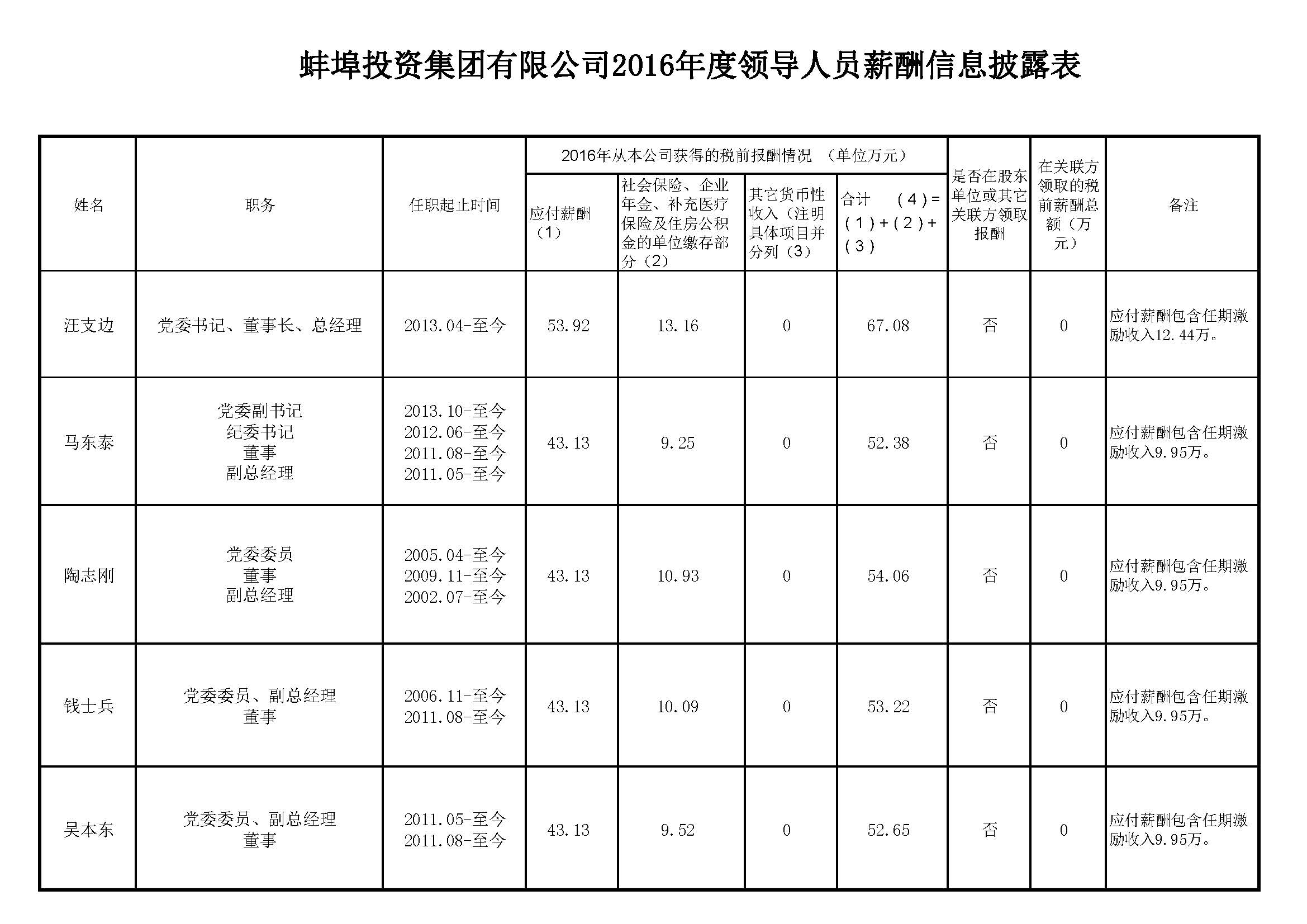蚌埠投資集團有限公司2016年度領(lǐng)導(dǎo)人員薪酬信息披露