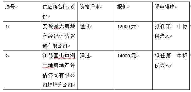 高鐵蚌埠南站西廣場(chǎng)、蚌投科技園物業(yè)服務(wù)費(fèi)評(píng)估項(xiàng)目于2021年10月18日發(fā)布招標(biāo)公告,經(jīng)兩次流標(biāo),第三次招標(biāo)公共于2021年11月04日發(fā)布,2021年11月11日9:00本項(xiàng)目開(kāi)標(biāo),三家報(bào)名現(xiàn)場(chǎng)兩家參與,按招標(biāo)文件要求現(xiàn)場(chǎng)議價(jià),經(jīng)過(guò)專(zhuān)家評(píng)審,經(jīng)與投標(biāo)單位溝通均表示不再下浮,按招標(biāo)文件要求符合議價(jià)程序?,F(xiàn)公告排名如下: